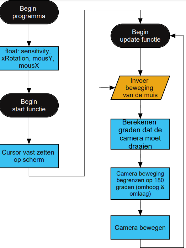 In de bovenstaande flowchart wordt er beschreven hoe de gebruiker met behulp van de computermuis het karakter kan laten rondkijken. We beginnen met het declareren van