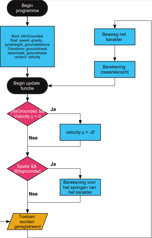 de grond staat. Als dit zo is zetten we de positie van het karakter op de grond. Hierna gaan we controleren of er op de spatiebalk wordt gedrukt en het