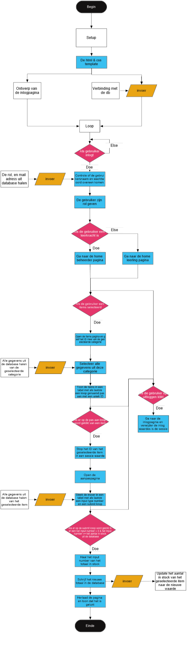In de flowchart zien we hoe de stappen van de code overlopen worden