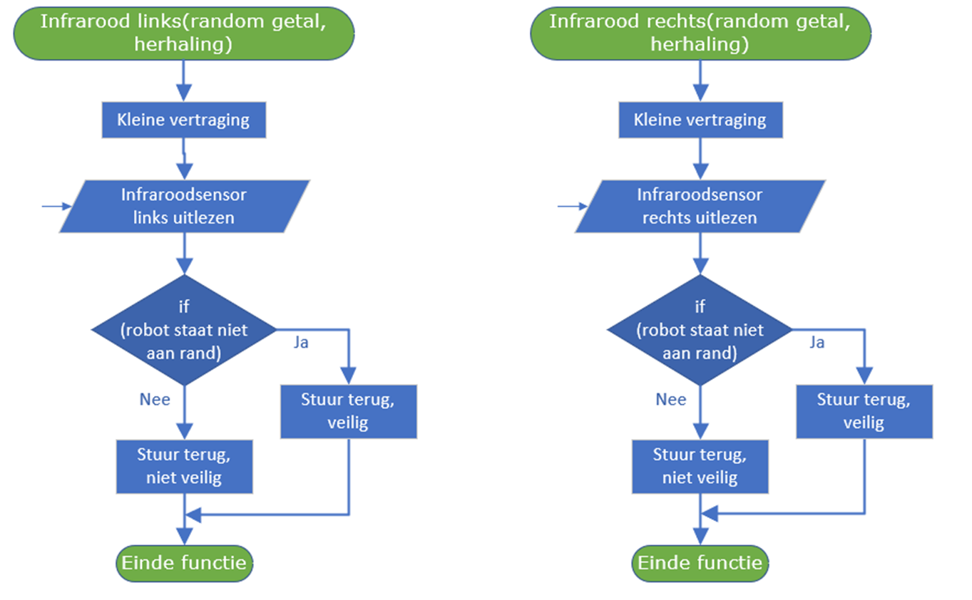 Het programma blijft zich oneindig herhalen. Er zal altijd eerst door de sensoren gekeken worden of het veilig is om te stappen. Vervolgens zet het robotje een willekeurig aantal stappen. Na elke stap wordt er via de infrarood sensoren gecontroleerd of de robot nog niet aan de rand van een tafel staat. Als het robotje wel aan de rand staat zal het naar achter stappen. Vervolgens zal het robotje een willekeurig aantal keer draaien.