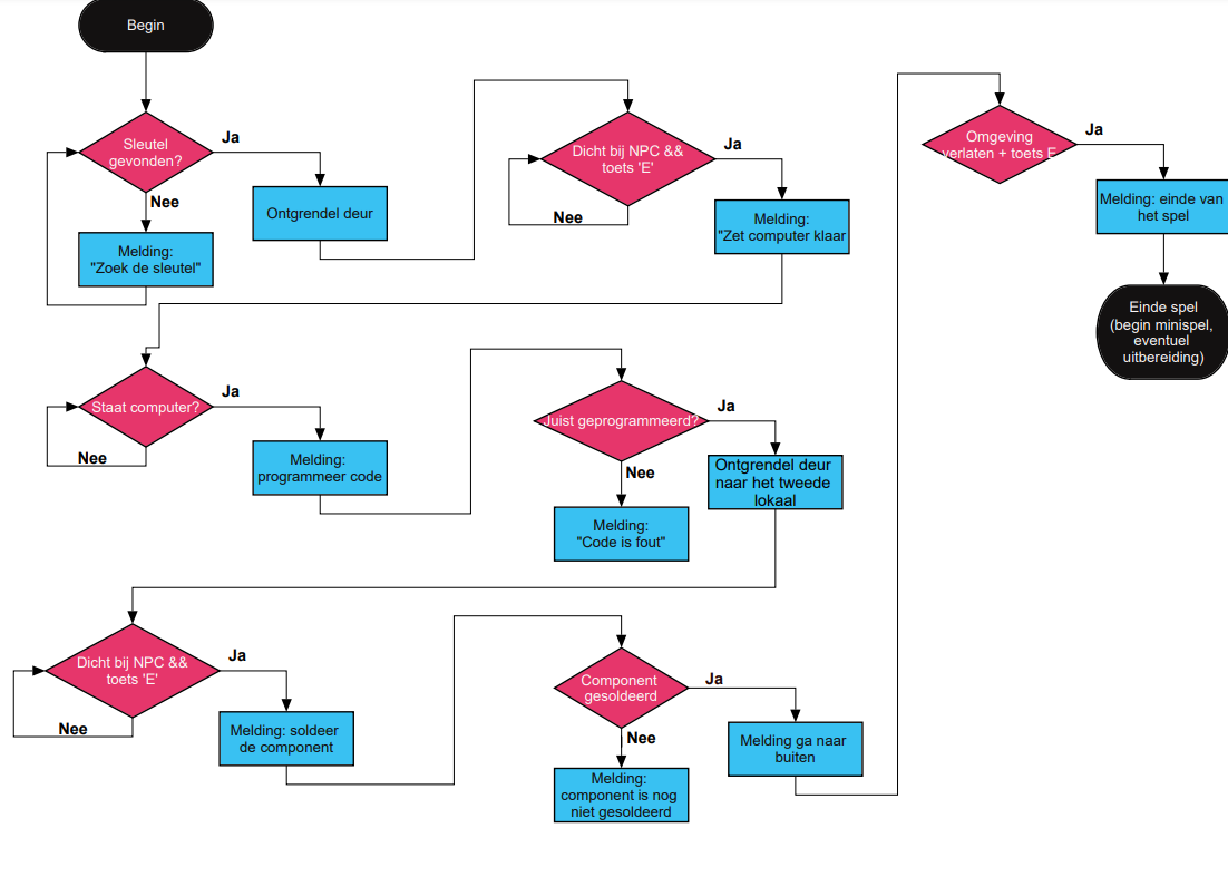 Hierboven ziet u de globale flowchart van mijn eindwerk. Hierin wordt beschreven hoe het spel ongeveer zou verlopen. Als omgeving neem ik het elektronica