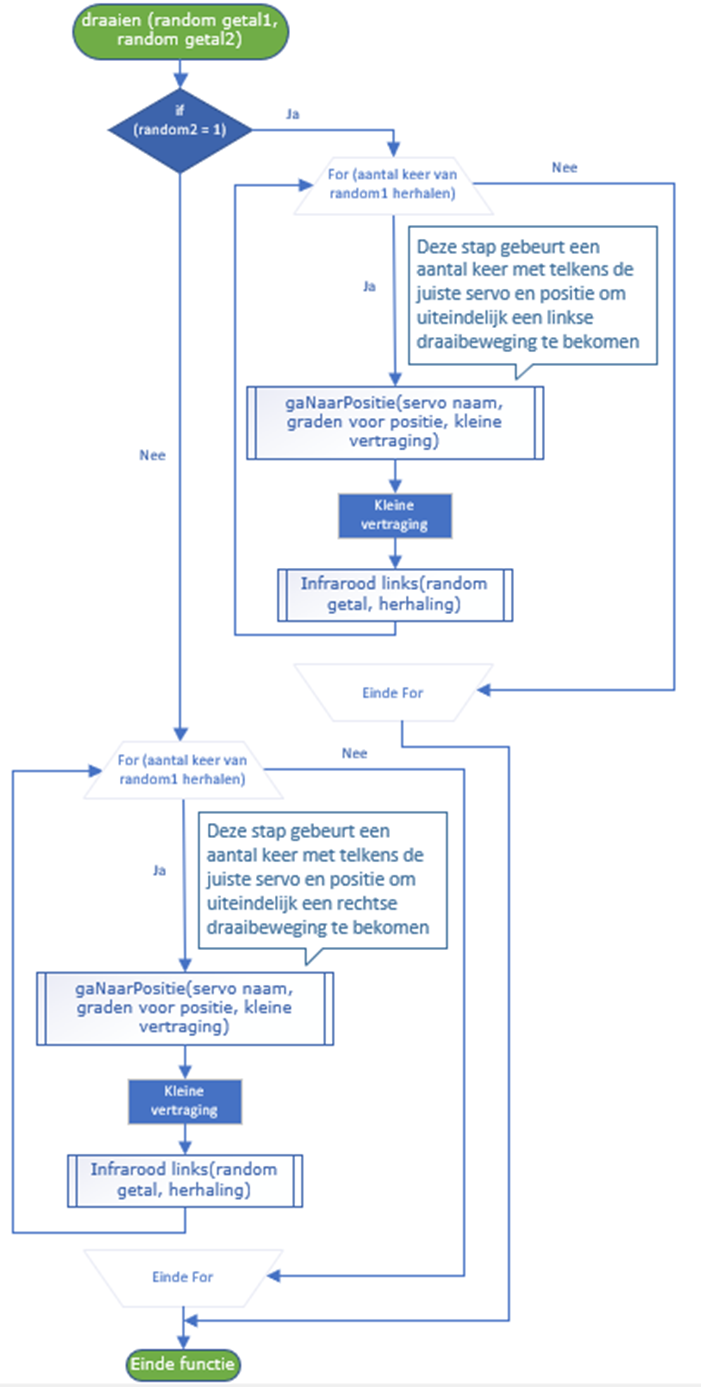 Het programma blijft zich oneindig herhalen. Er zal altijd eerst door de sensoren gekeken worden of het veilig is om te stappen. Vervolgens zet het robotje een willekeurig aantal stappen. Na elke stap wordt er via de infrarood sensoren gecontroleerd of de robot nog niet aan de rand van een tafel staat. Als het robotje wel aan de rand staat zal het naar achter stappen. Vervolgens zal het robotje een willekeurig aantal keer draaien.