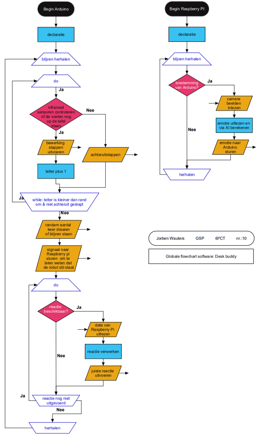 Het programma blijft zich oneindig herhalen. Er zal gewacht worden op en signaal van de Arduino vooraleer de bewerkingen worden uitgevoerd. Als de Raspberry Pi een signaal ontvangt zullen er eerst foto’s van de Pi camera uitgelezen worden. Aan de hand van AI zal uitgedrukte emotie uitgelezen worden en vervolgens wordt dit naar de Arduino gestuurd. Daarna zal het dan terug opnieuw beginnen.